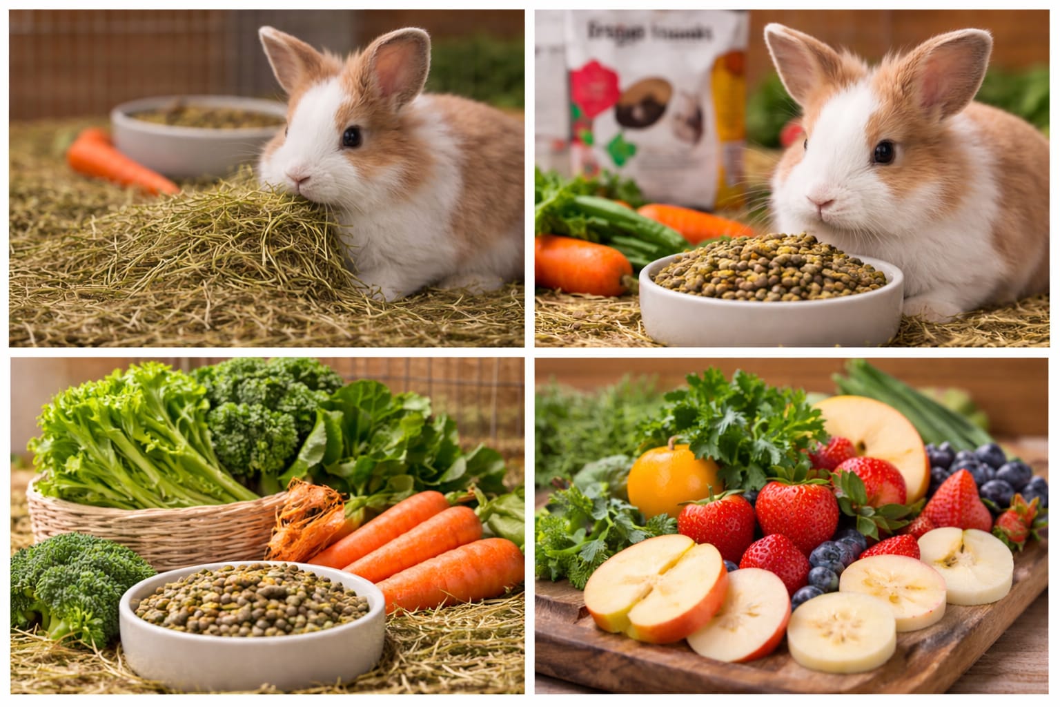 Pe lângă fân, iepurii pot primi hrană specială sub formă de granule, care conține vitamine, fibre și minerale importante.Este recomandat să alegi hrană de calitate, special formulată pentru iepuri, care să conțină: