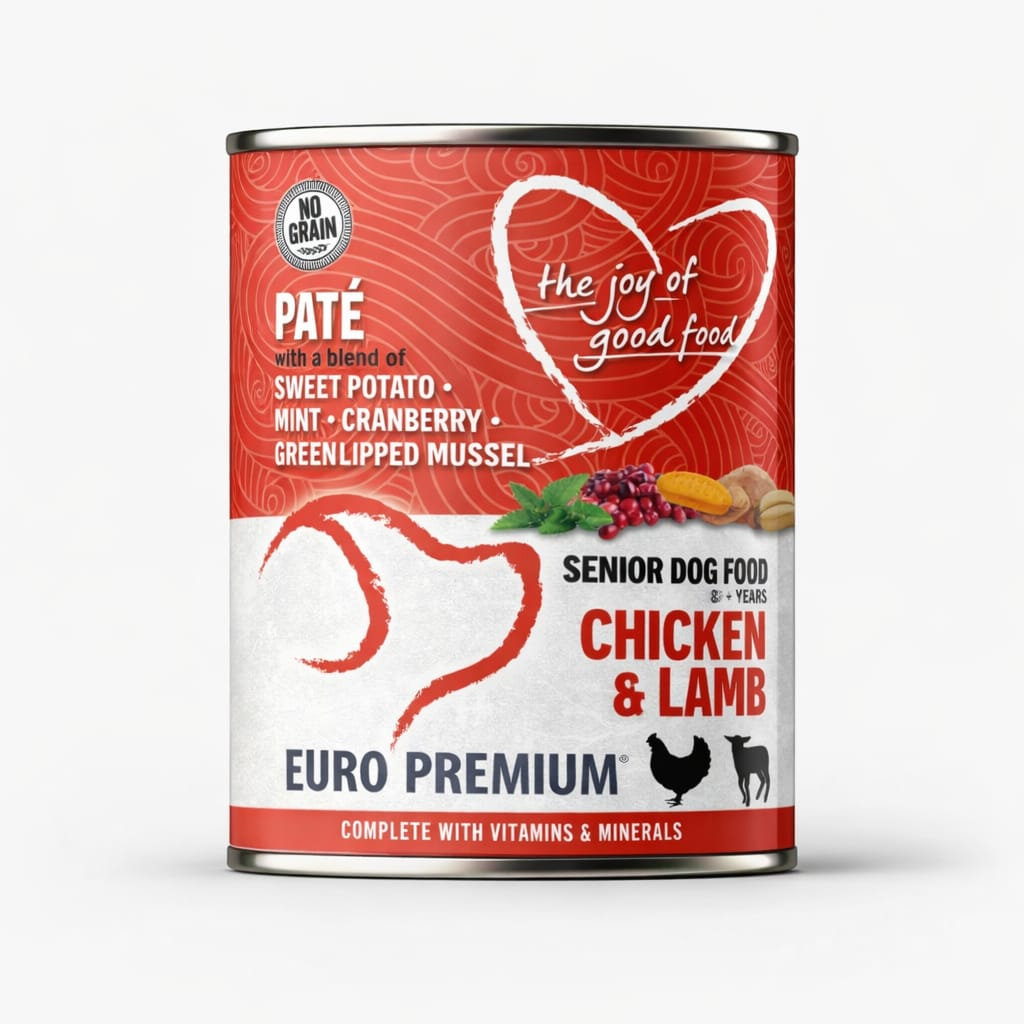 Pate cu pui și miel pentru câini, Euro Premium, este o hrană umedă completă, gustoasă și ușor digerabilă, ideală pentru câini adulți și seniori.